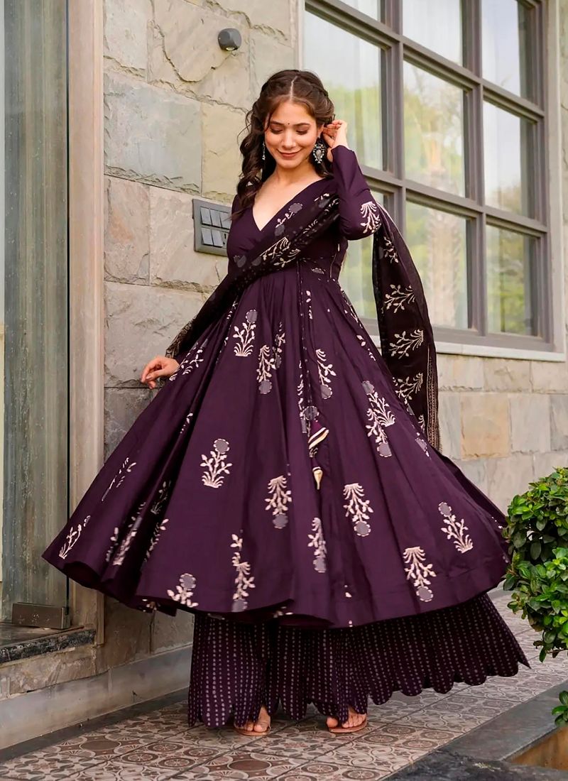 Dark purple Flared Digital Printed Anarkali Palazzo Suit