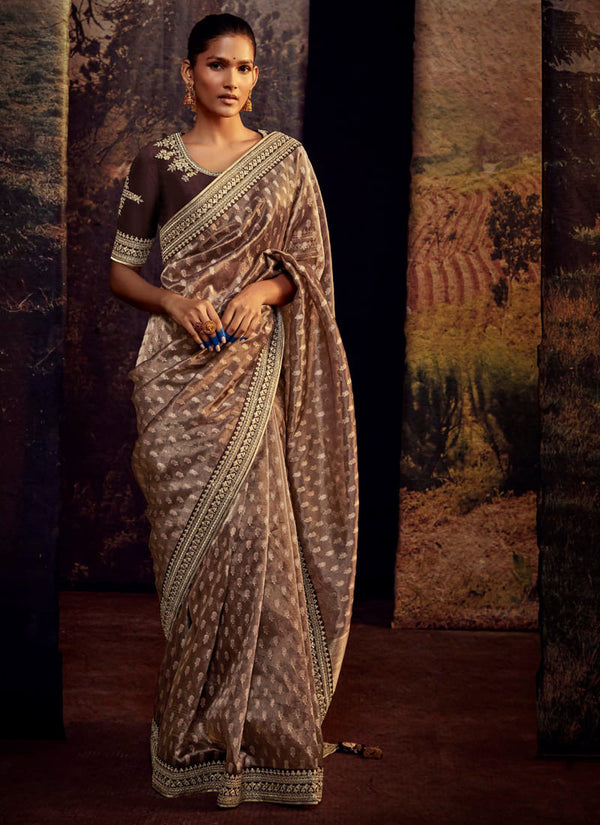 Lassya Fashion Light Brown Pure Tissue Silk Saree with Mirror-Zari Work