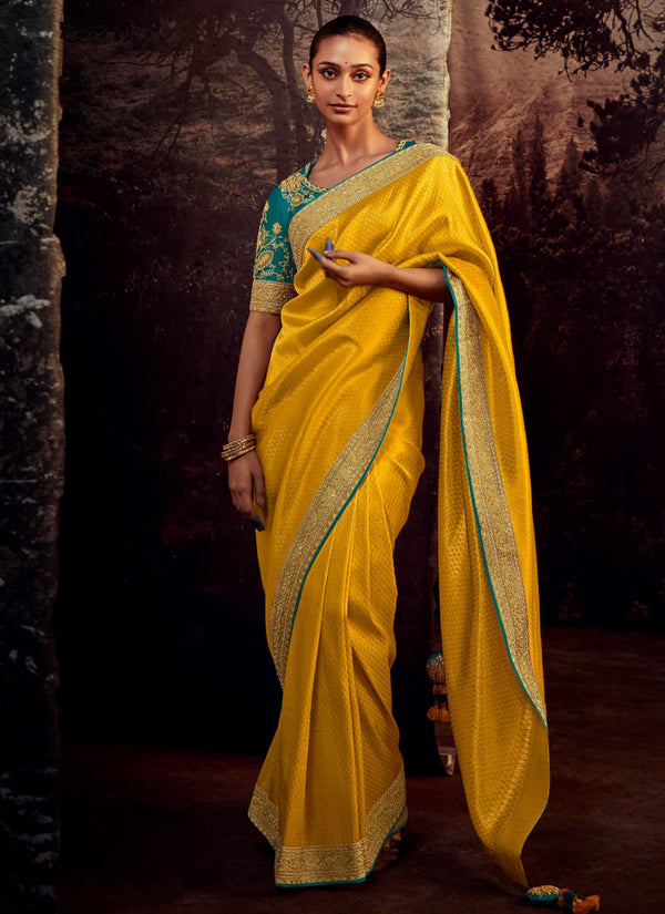 Lassya Fashion Mustard Yellow Pure Tissue Silk Saree with Mirror-Zari Work
