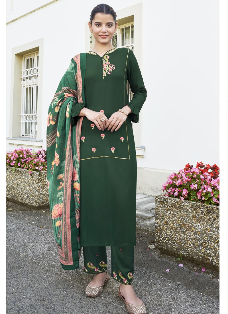 Olive Green Embroidered Rayon Salwar Suit with Digital Print Dupatta