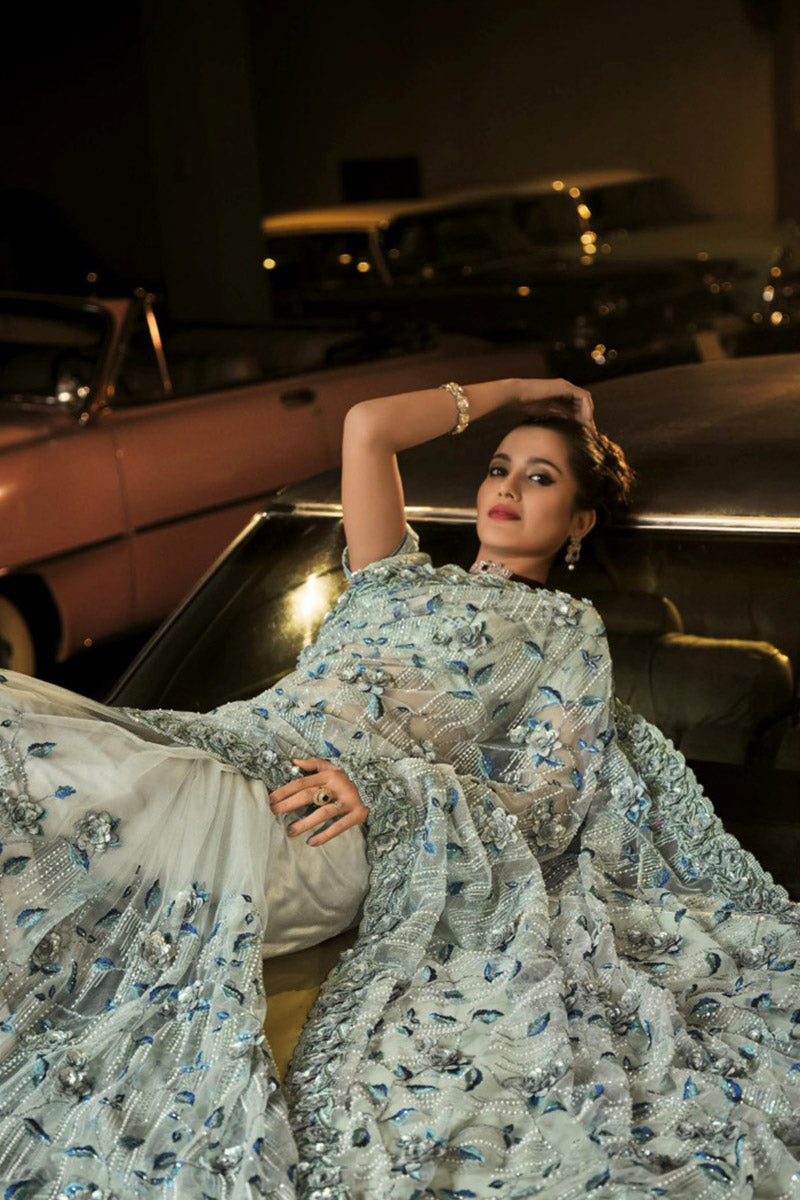 A stunning grey digital net saree with intricate hand-made flower designs, adorned with heavy jari, thread, moti, cut-dana, and sequence work. Made with high-quality digital net fabric and paired with a luxurious Italian silk blouse.