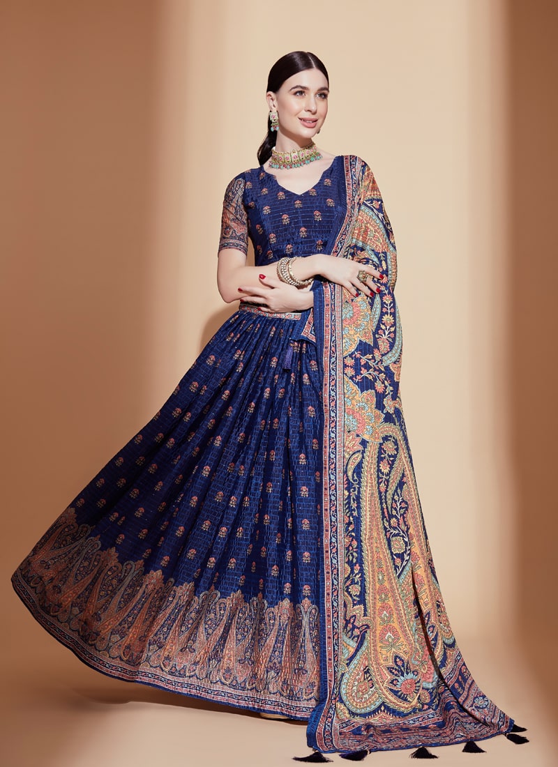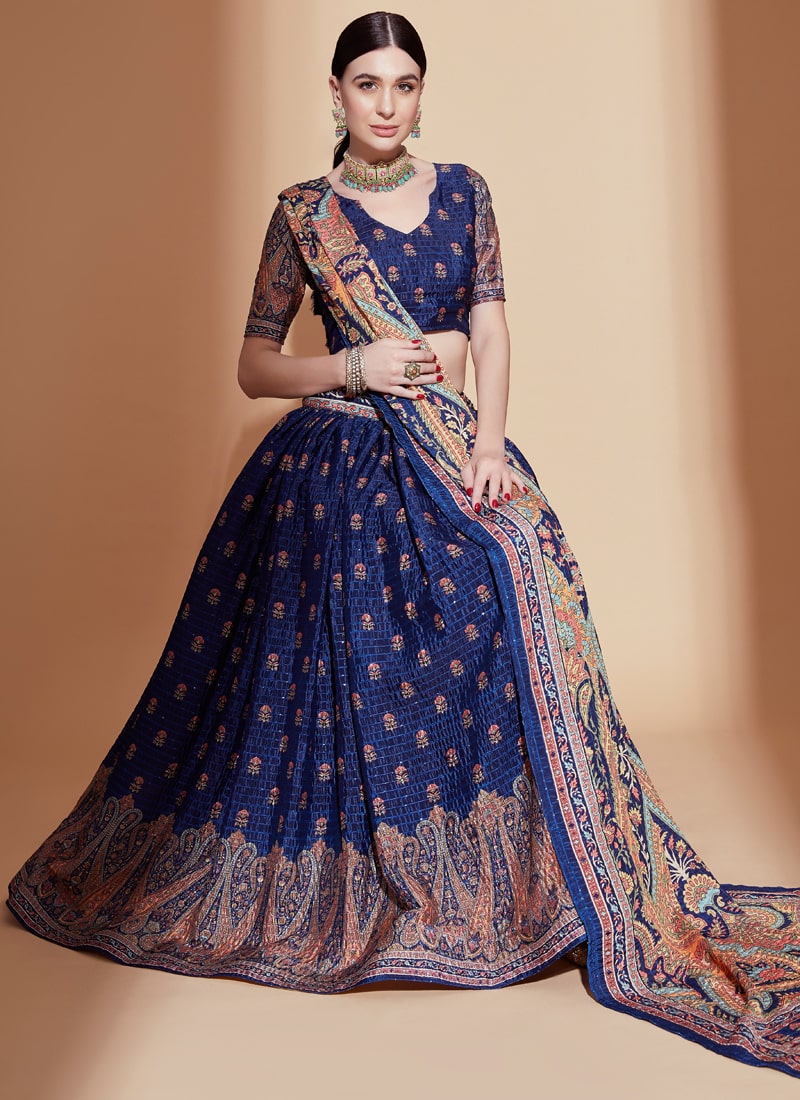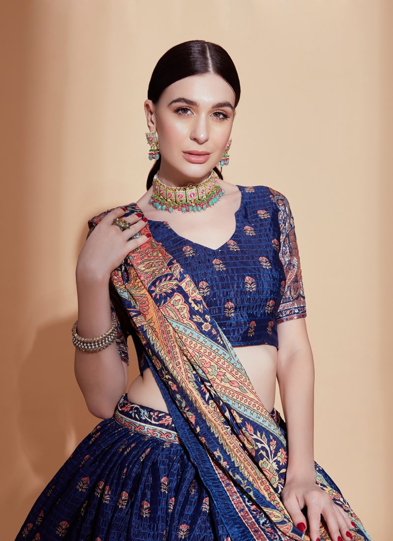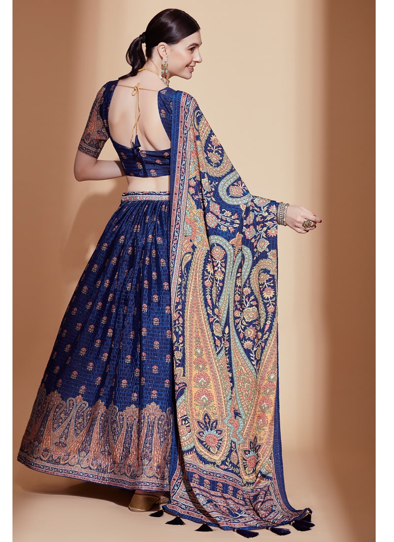 Indigo Blue Designer Print Lehenga Choli with Embroidery Work